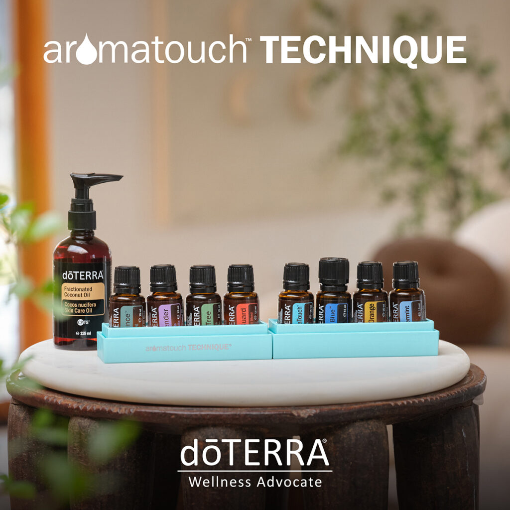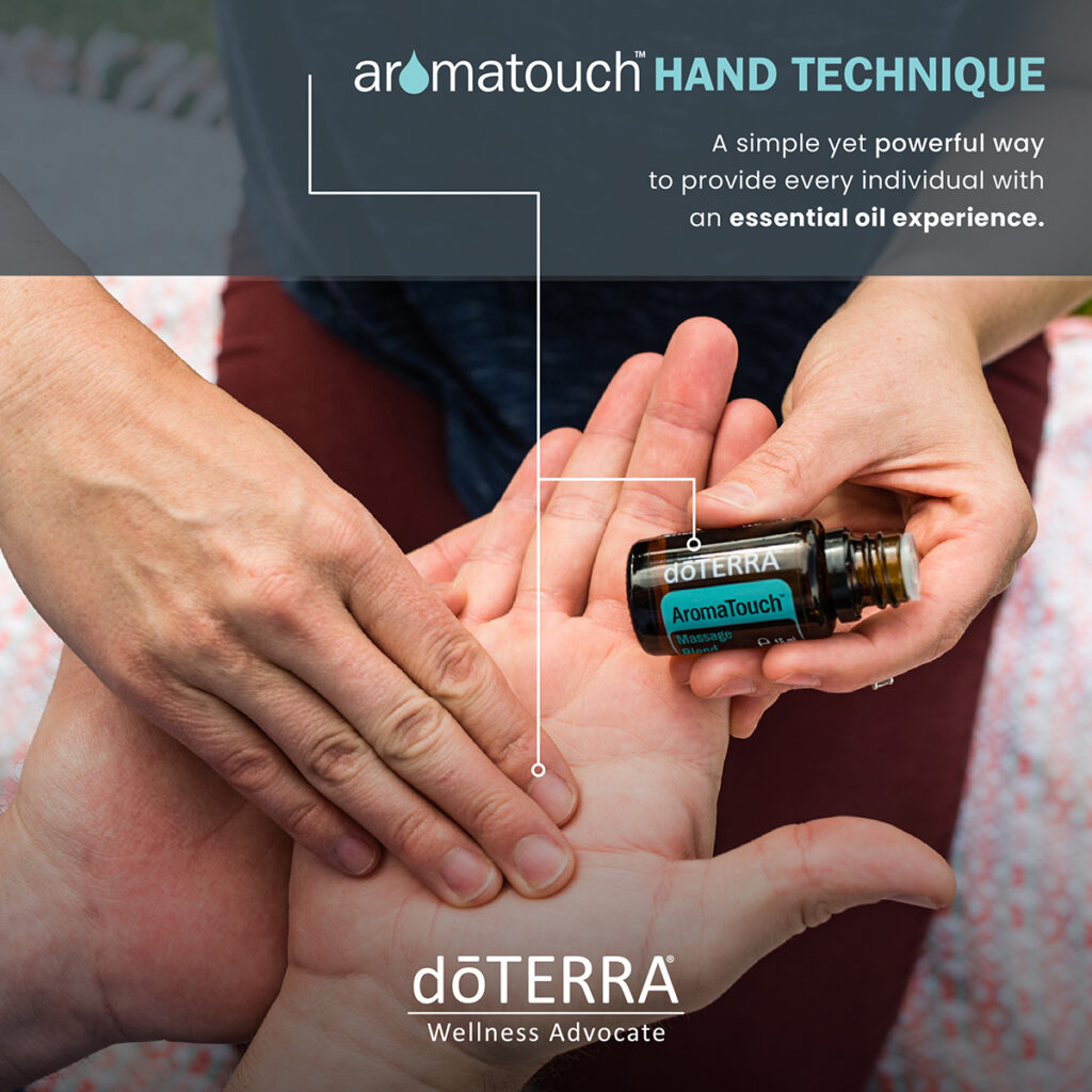 Eine Aroma Touch Anwendung verbindet die einzigartige Wirkung der menschlichen Berührung mit der Kraft von ätherischen Ölen. Dabei werden acht verschiedene Öle in einer bestimmten Reihenfolge auf die Energie-Zonen des Rückens und der Füße aufgetragen und sanft einmassiert.